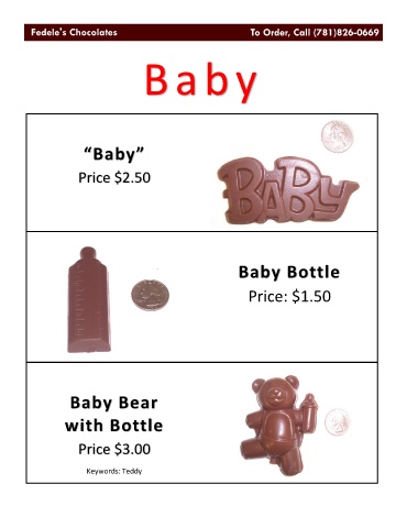 Baby “Baby” Price $2.50 Baby Bottle Price: $1.50 Baby Bear with Bottle Price $3.00 Keywords: Teddy