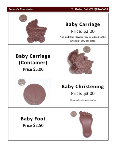 Baby Carriage Price: $2.00 Pink and Blue Flowers may be added to the wheels at 50¢ per piece Baby Carriage (Container) Price $5.00 Baby Christening Price: $3.00 Keywords: religious, church Baby Foot Price $2.50
