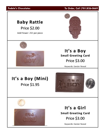 Baby Rattle Price $2.00 Add Flower: 25¢ per piece I t ’s a Boy Small Greeting Card Price $3.00 Keywords: Gender Reveal I t ’s a Boy (Mini) Price $1.95 I t ’s a Girl Small Greeting Card Price $3.00 Keywords: Gender Reveal