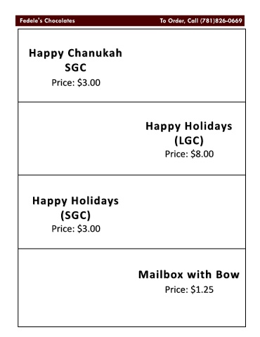 Happy Chanukah SGC Price: $3.00 Happy Holidays (LGC) Price: $8.00 Happy Holidays (SGC) Price: $3.00 Mailbox with Bow Price: $1.25