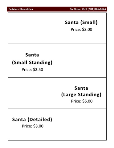 Santa (Small) Price: $2.00 Santa (Small Standing) Price: $2.50 Santa (Large Standing) Price: $5.00 Santa (Detailed) Price: $3.00